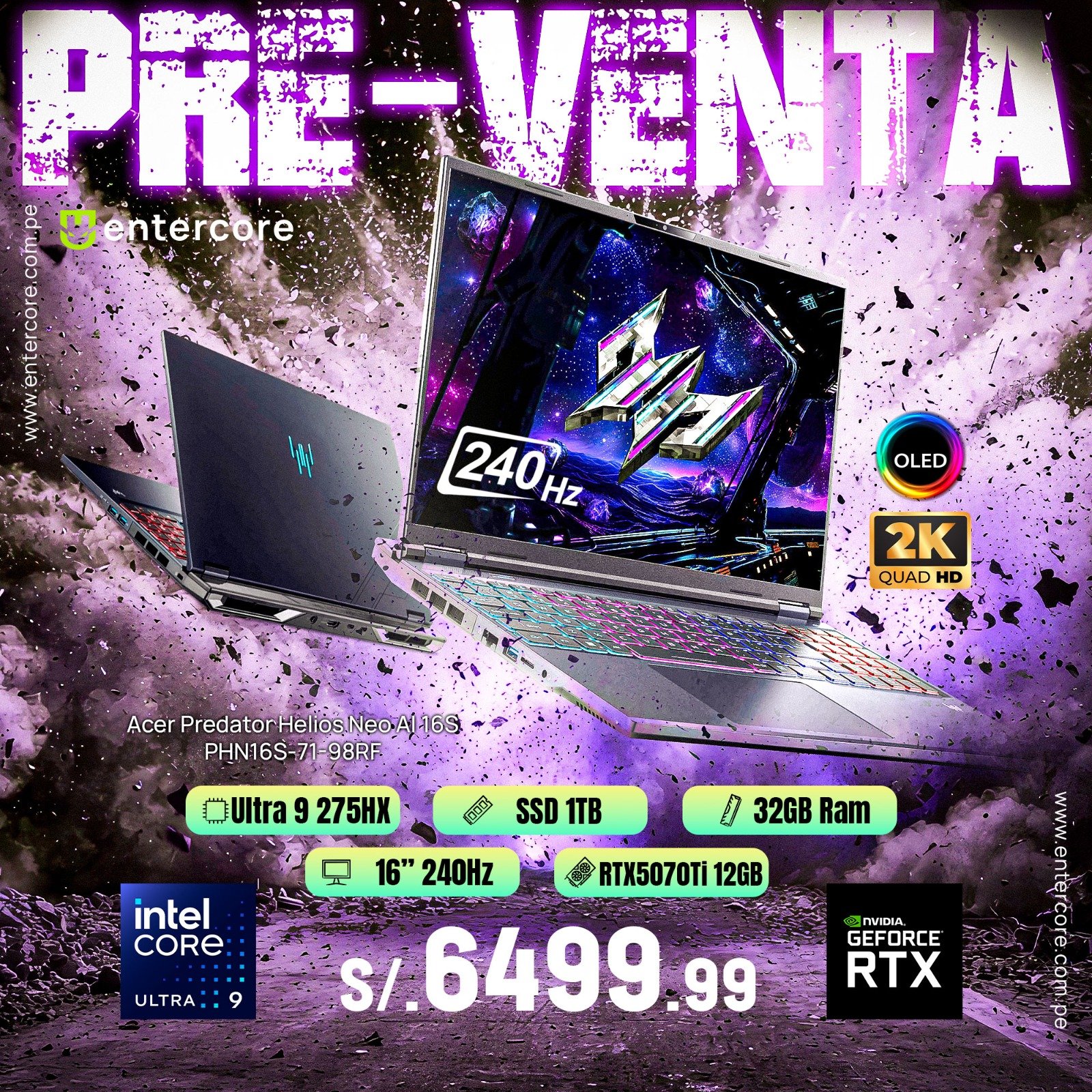 LAPTOP ACER PREDATOR HELIOS NEO 16S AI PHN16S-71-98RF INTEL CORE ULTRA 975HX 32GB RAM DDR5 1TB SSD M.2 4.0 16″ OLED WQXGA (2560 × 1600) 240HZ NVIDIA GeForce RTX 5070 Ti 12 GB GDDR7 BLACK Backlit Keyboard WIN11 (PREVENTA)